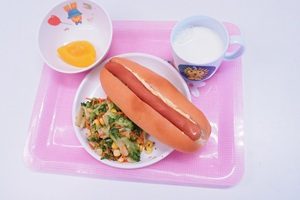 給食はホットドッグと温野菜のサラダでした。エッグサラダにソーセージがとてもおいしいです。温野菜のサラダも出汁の味がきいていておいしいです。