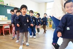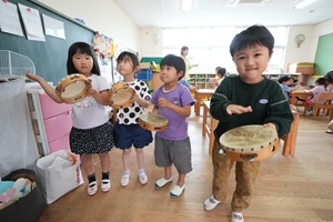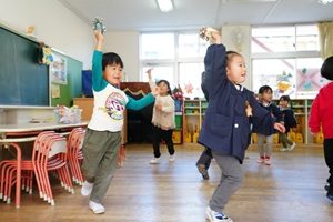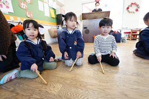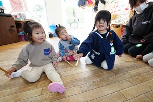 うめ組,年少組さんでリトミックがありました。今回はクリスマスにちなんで,トナカイになったり,そりを作ったりしてリズム遊びをしました。シロクマやカンガルーも登場しました。