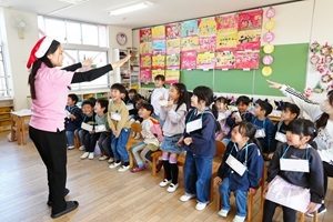 今日は英語レッスンがありました。クリスマスの格好を先生がしていました。初めての先生でしたが,ゲームをしたり歌ったり英語で楽しく遊びました。