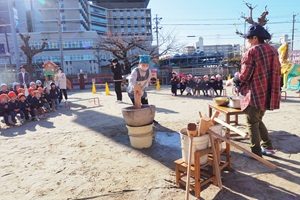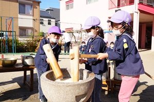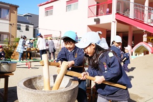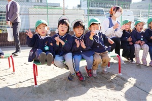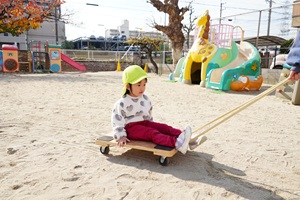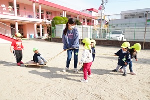 うめ組さんはそり遊びをしました。雪がないのでみんなでがんばって引っ張り,交代でのりました。楽しかったですね。