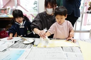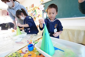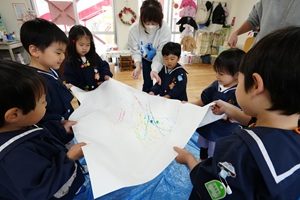 年少組さんは,模造紙の上で絵の具のついたビー玉を転がして模様をかきました。ビー玉が落ちないようにするのが楽しかったです。