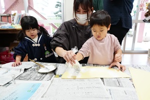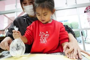 うめ組さんは水の入ったビニール袋に絵の具を塗って,模様をかきました。これからケーキができます。