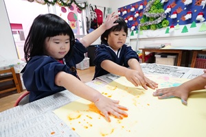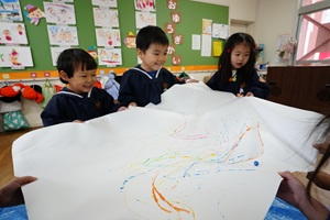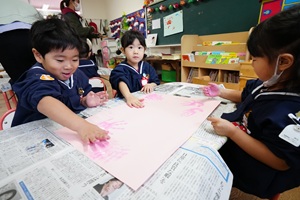 年少組さんは手に絵の具をつけた,ベタベタ手形をつけて模様をかきました。絵の具の感触が面白かったですね。