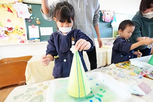 年中組さんはスポイトで絵の具をたらしてクリスマスの飾りを作りました。寒くなって,クリスマスらしくなってきましたね。