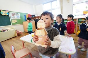 年中組さんはクマが餅つきをするおもちゃを作りました。クマさんがお餅をぺったんついていました。