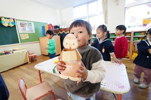 年少組さんはおさるの製作をしました。おさるがバナナをキャッチします。かわいいおさるですね。