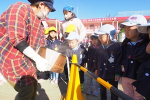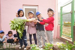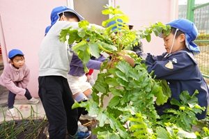 今年初めてのダイコンを収穫しました。長さが短いですが,きれいな形のダイコンでした。給食で食べましょう。