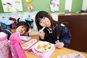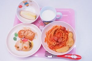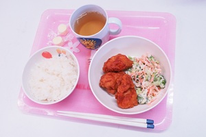 給食は唐揚げでした。ブロッコリーのサラダがついていました。みんな大好きです。