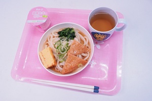 給食はきつねうどんでした。大きな卵焼きがついていました。揚げも甘辛くておいしかったです。