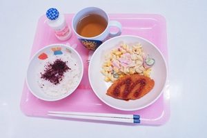 給食は,白身魚フライとマカロニサラダでした。フライはサクサクで,マカロニはツルツルでおいしかったです。ゆかりご飯もいけます。