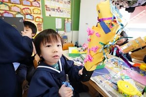 今日は1月の誕生会をしました。舞台の上で,名前と何歳になったかを一人ずつ言いました。その後で,先生たちが楽しい出し物を見せてくれました。