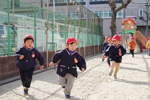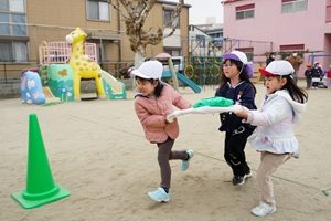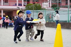 今朝は,とても冷えましたね。幼稚園では,全員でだるま運び競争をしました。色々な学年がまざって,協力してだるまを運びました。みんなで遊ぶと楽しいです。