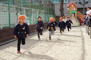 マラソン会の練習が始まりました。白水公園グランドはまだ使えないので,園庭を走りました。コーンの内側を走ってはいけません。