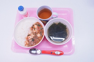 給食は甘辛そぼろ魚ごはんと,具たくさん味噌汁でした。魚のそぼろをご飯にまぶすとおいしいです。温かいお味噌汁も良かったです。