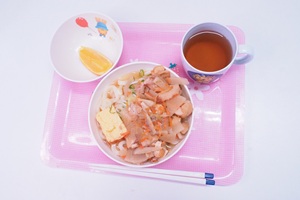 給食はけんちんうどんでした。サトイモ,ゴボウ,ニンジン,ダイコンがたくさん入っています。卵焼きものってました。温かくておいしかったです。