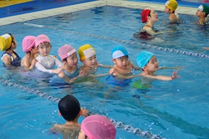 年中組,年長組さんは水泳指導がありました。水泳が得意な人は,飛び込んでクロールで泳いでいましたね。