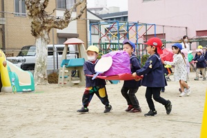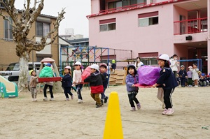 今日は,全員でおひな様を運ぶ競争をしました。うめ組,年少組さんも年中組,年長組さんと一緒に3人一組で運びました。優しく運ばない転がってしまうので,ゆっくり運びました。