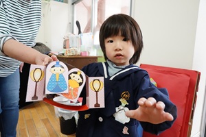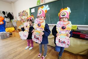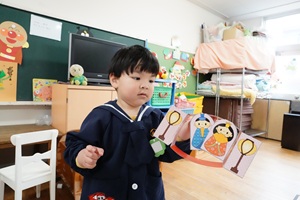 2月の誕生会がありました。舞台の上で,名前と何歳になったかを一人ずつ発表しました。先生が楽しいペープサートを見せてくれました。ミャクミャクとも写真を撮りました。
