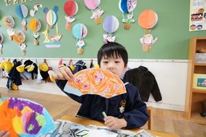 年長組さんは気球の製作をしました。短冊状に切った紙をていねいに丸くしていきます。年長組さんは手先が器用になりました。