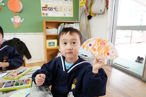 年少組さんはおひな様を作りました。台紙から切り取って,折って,糊でつけて完成です。きれいにできましたね。お家で飾ってください。
