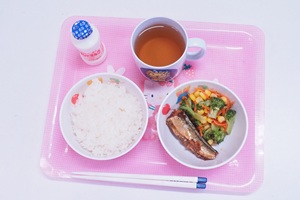 給食は初メニューで,さんまの生姜煮と温野菜でした。サンマが甘辛く煮込まれていておいしかったです。ブロッコリーとコーンとニンジンも味がついていておいしいです。