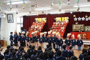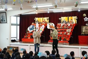 今日は3月の誕生会とひな祭り会をしました。ひな飾りの前で,名前と何歳になったかを発表しました。教室では先生からプレゼントをもらいました。給食もスペシャルメニューで,ひなあられも食べました。