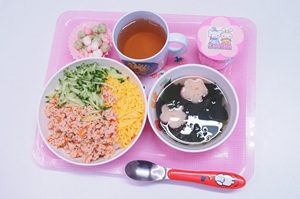 給食はひな祭りのスペシャルメニューです。三色丼とすまし汁です。桃ゼリーにもおひな様がついていました。ひなあられもポリポリしておいしかったです。