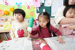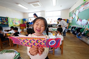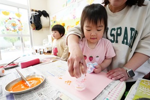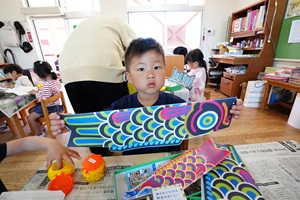 うめ組さんも鯉のぼりを作っています。鯉のぼりの台紙に,絵の具をつけた容器で,ペタペタと,うろこの模様をつけました。絵の具を初めて使いましたね。
