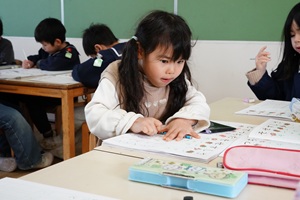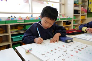 年長組さんは文字の練習をしました。ひらがなを一文字ずつ丁寧に書いています。消しゴムで消しながらがんばりました。