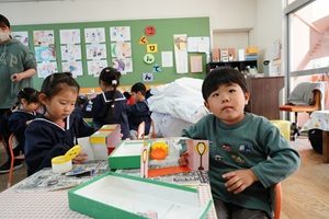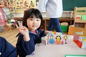 年少組さんはおひな様を作りました。台紙から切り取って,折って,糊でつけて完成です。きれいにできましたね。お家で飾ってください。
