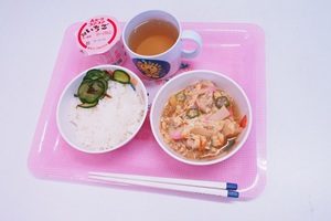 給食は親子煮でした。今流行っている「飲める~」みたいにとろとろです。幼稚園でとれた野菜がたくさん入っていました。