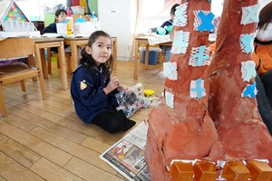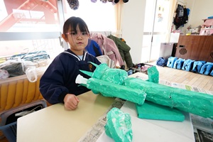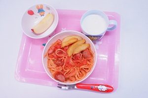 もうすぐ作品展ですね。 もうすぐ作品展です。教室の飾り付けも始まりました。立派な作品も完成に近づいてきました。 給食はスパゲティでした。フライドポテトもついています。おいしいけれど,口の周りが赤くなりますね。