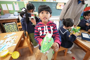 年中組さんはドラゴンの製作をしました。大きな作品なので,折ったり,のりを貼ったりするところがたくさんあって大変でした。かっこよいドラゴンができました。