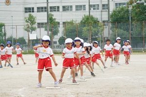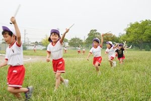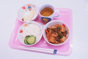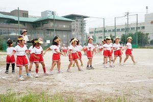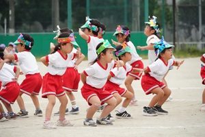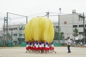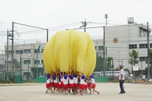 バルーンや遊戯を練習しました。 年長組,年長組さんはグランドでバルーンや遊戯の練習をしました。小道具も少し使ってみました。グランドの草がボウボウですね。草刈りをして欲しいです。 給食は厚揚げと豚肉のみそ煮でした。リンゴがついていました。おいしかったです。