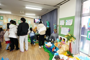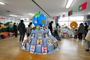 今日は作品展本番です。あいにくの雨で,移動動物園は延期になりましたが,アンパンマンが来てくれました。お家の人にがんばって作った作品を見てもらいました。
