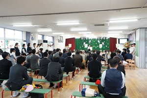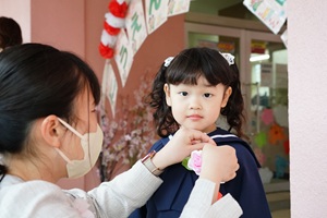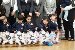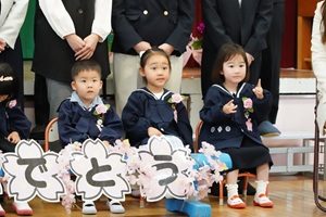 今日は入園式を行いました。先生からお花をつけてもらい,遊戯室で先生のお話を聞きました。その後,みんなでクラス写真を撮りました。来週からいっぱい遊びましょう。