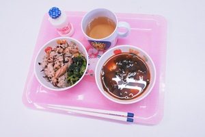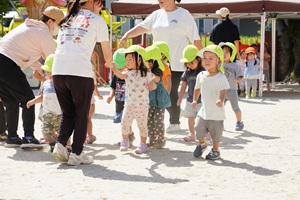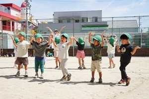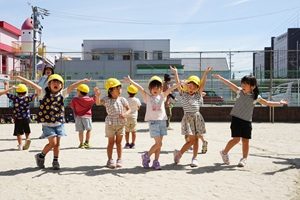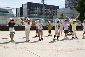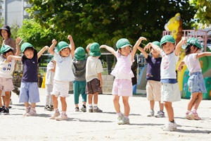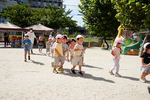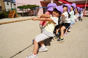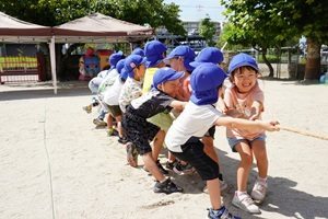 園庭で遊戯の練習をしました。 やっと涼しくなってきましたね。うめ組,年少組さんは園庭でかけっこや行進の練習をしました。 年長組さんは綱引きをしました。先回よりも上手になってきました。3回やって,紫組さんが2勝でした。 年中組さんは遊戯の練習をしました。カーニバルのポーズが決まっていますね。 給食は炊き込みご飯でした。わかめと豆腐のお味噌汁がついています。炊き込みご飯は味が良くしみていておいしかったです。