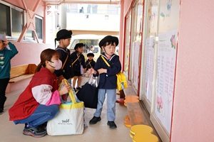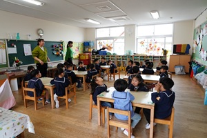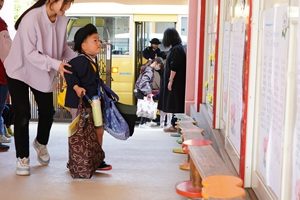 始業式をしました。 今日は,始業式をしました。登園したら,新しいクラス発表を見ました。自分の前がどこにあるか見つけて,新しいクラスに行きました。園庭で始業式を行い,教室では自己紹介などをしました。明日からは,年少組さんも登園してきます。仲良く遊びましょう。