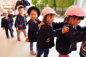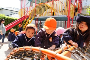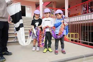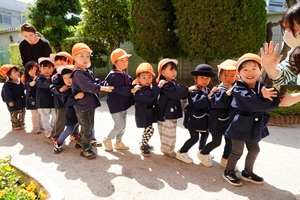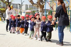 年少組さんも登園しました。 今日はとても良い天気になりましたね。年長組さんが鯉のぼりをあげました。青空を背景にきれいですね。 年少組さんも今日から,みんなと一幼稚園で緒に遊びました。クラスで列になって,色々な遊具で遊びました。あっという間に時間が過ぎました。