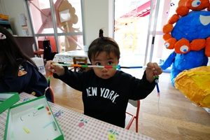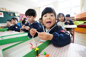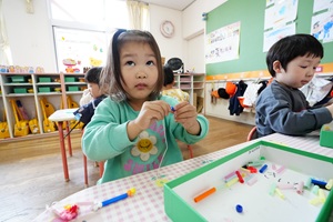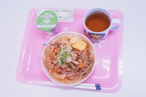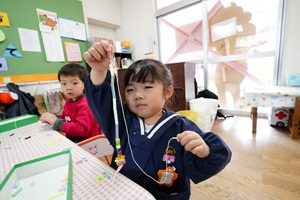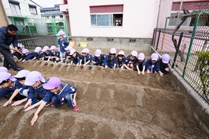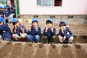 年長組さんへのプレゼントを作っています。 年長組さんがジャガイモの種芋を植えました。年長組さんは収穫できませんが,大きくなったら見に来てください。 うめ組,年少組さんは年長組さんへのお別れのプレゼントを作っています。ビーズの首飾りです。ビーズを糸に一つずつ丁寧に通していきました。 給食はけんちんうどんでした。お肉と野菜たくさん入っていて,卵焼きものっていました。少し甘口で温かくておいしかったです。