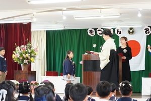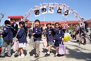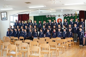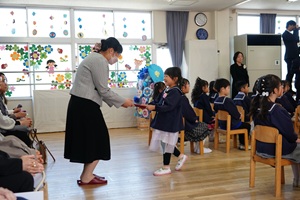第七十回卒園式 第七十回卒園式が行われました。登園したら,先生からお花をつけてもらいました。園長先生から修了証書を渡され,お家の方にお礼を言って渡しました。みんなでお別れの言葉と歌を歌いました。園庭ではお花のアーチをくぐって,最後のお別れをしました。