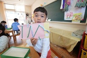 年中組さんは鯉のぼりのうろこを太い毛糸を使って表現しました。毛糸をうろこのように通していくのは難しかったです。
