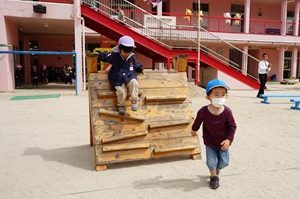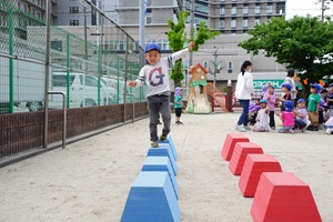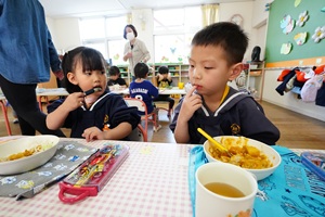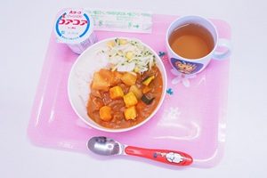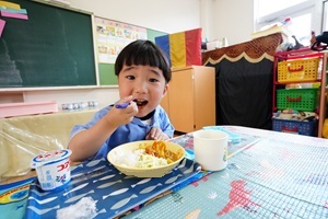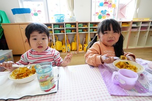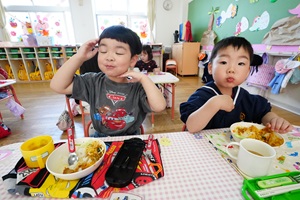 給食が始まりました。 今日から,給食が始まりました。カレーライスでした。初めての給食の人もいましたね。おいしかったので,おかわりした人もいました。 年長組さんは障害物競走をしました。ブロックに乗って,平均台を渡って,様々な障害物を乗り越えました。男の子は青組,女の子は紫組が速かったです。 給食はカレーとヨーグルトでした。カボチャがたくさん入った甘口のカレーです。みんなの大好きなメニューですね。