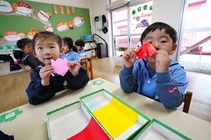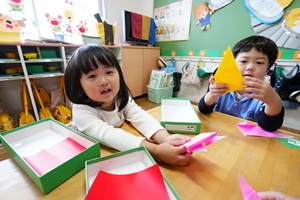 年中組さんは折り紙で,チューリップを折りました。幼稚園のチューリップは終わりましたが,折り紙のチューリップはきれいに咲きました。