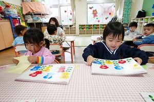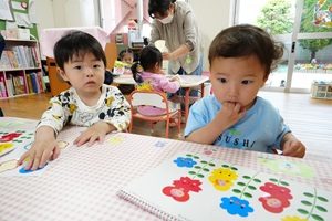 うめ組さんは,シールの絵本をしました。シールを貼って,お花をいっぱい咲かせました。