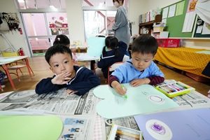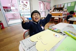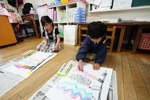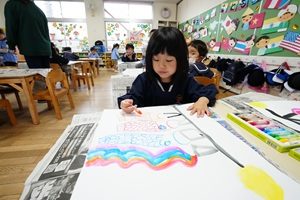 年中組さんは鯉のぼりの絵をかきました。風にゆらゆら泳いでいる様子が上手にできましたね。うろこも細かくかくことができました。