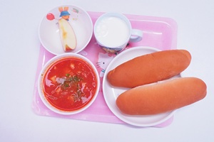 給食は,人気メニューのポトフ風トマト煮込みでした。トマトの甘さと酸味がパンによく合っておいしいです。リンゴもおいしかったです。