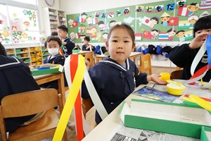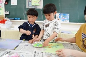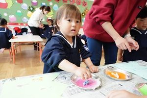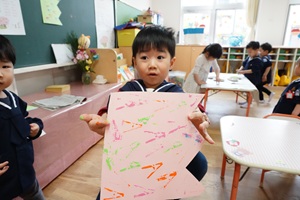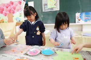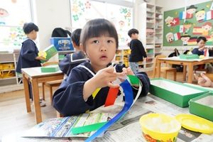 鯉のぼりの製作をしています。 年少組さんは,洗濯ばさみに絵の具をつけて,鯉のぼりの台紙にペタペタうろこの模様をつけました。好きな色を選んで,カラフルな鯉のぼりになりましたね。 年長組さんは,細い紙をのりで貼って,吹き流しを作りました。これから,鯉のぼりも作っていきます。
