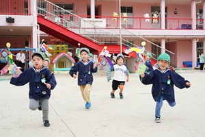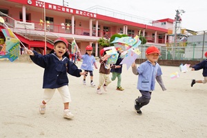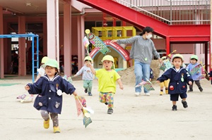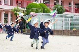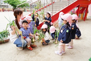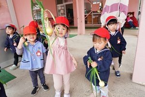 鯉のぼりを泳がせました。 うめ組,年少組,年中組さんが鯉のぼりを泳がせました。曇り空でしたが,元気いっぱいに泳いでくれました。 最後のタマネギを収穫しました。一人ずつ引っ張って,タマネギを抜きました。これからは,キュウリやトマトが大きくなってきます。 給食はサケと枝豆の混ぜご飯と,大根とわかめのお味噌汁でした。枝豆の味がご飯にしみていて,サケの塩辛さとまざっておいしいです。